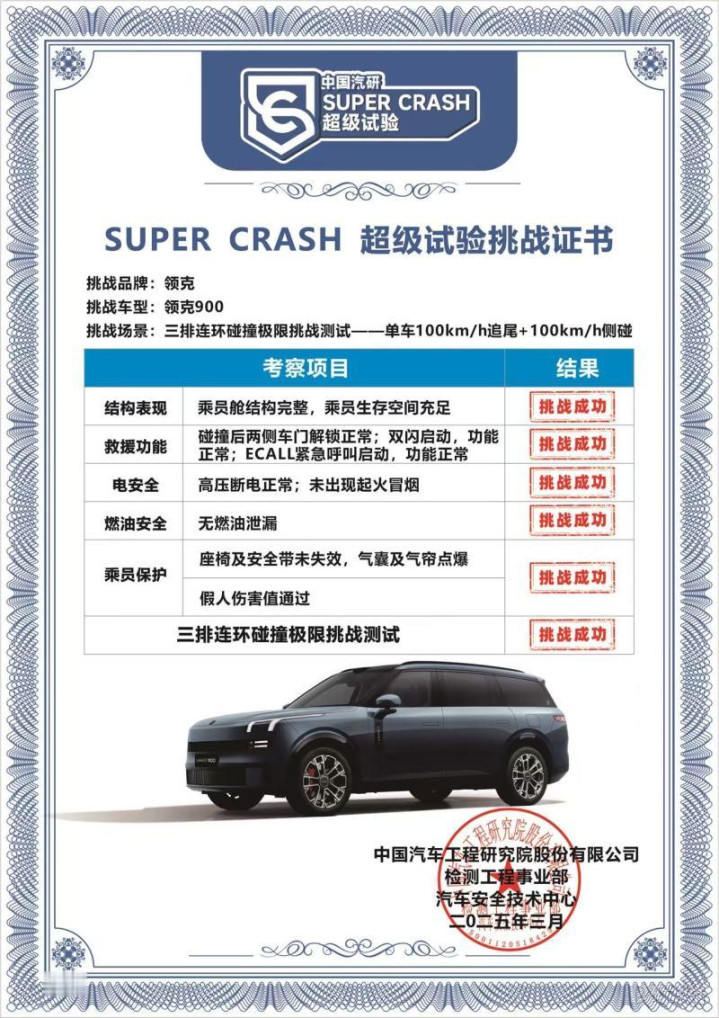 今年3月,领克900还完成“单车100km/h追尾+100km/h侧碰”的双百时速连环碰撞测试。结果显示,领克900正后侧三向碰撞测试均顺利通过。